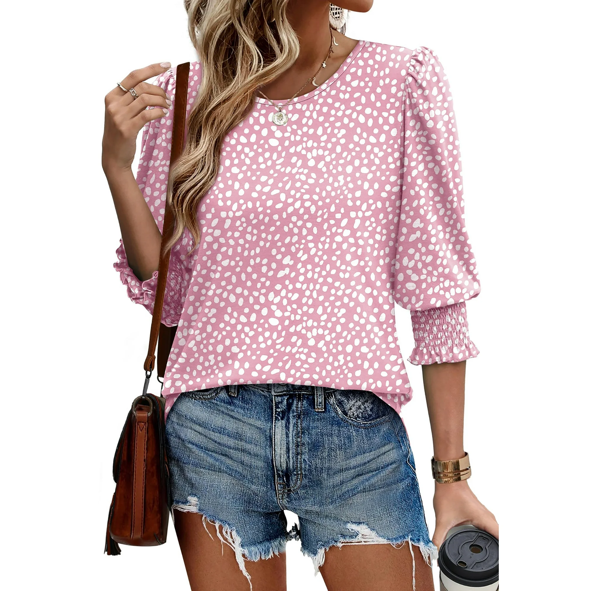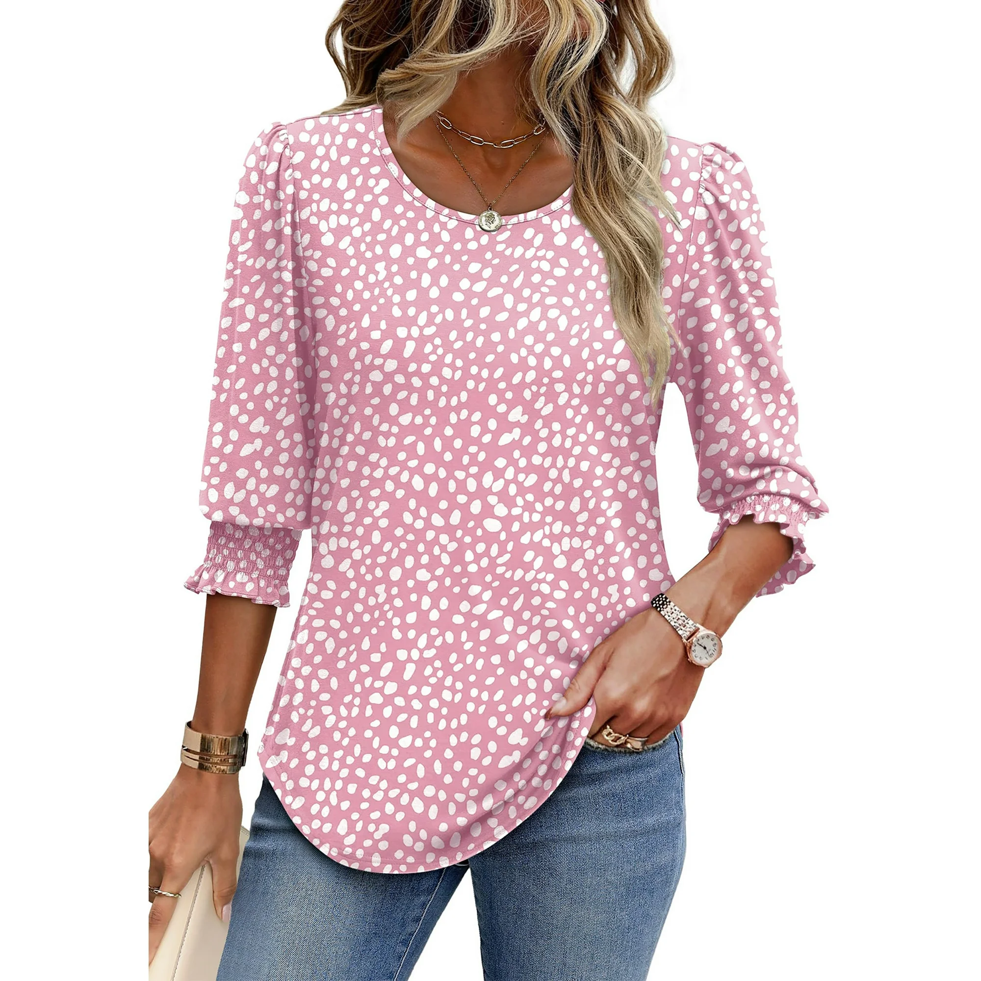 • 🌸【Design】- This 3/4 sleeve tops for women features a timeless and elegant design with stylish smocked cuffs and a flattering boat neckline that enhances your silhouette. The curved hem and classic crew neck detail offer a polished yet relaxed fit, beach vacation clothes for women, summer outfits for women, blouses for women dressy casual, tops for women trendy, plus size tops for women, vacation outfits, business casual tops for women, dressy blouses, floral tunic tops, 3/4 length sleeve womens tops making it perfect for both business casual and everyday wear. Whether you’re dressing it up with trousers or keeping it casual with jeans, 3/4 sleeve womens blouses transitions seamlessly between warm and cool weather—combining comfort, femininity, and effortless style in one chic piece